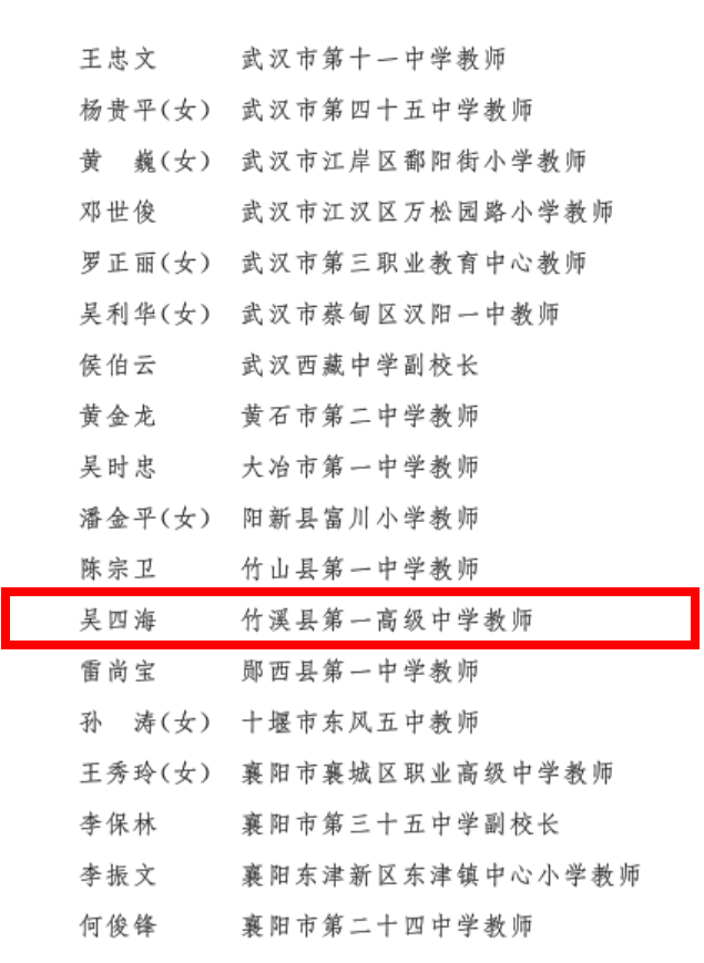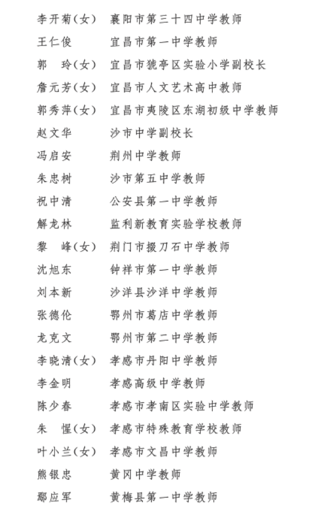 省人民政府关于第四届“楚天园丁奖”获奖者湖北省农村先进教师和先进教育工作者的通报鄂政发〔2022〕19号各市、州、县人民政府,省政府各部门:近年来,全省广大教师和教育工作者坚持以习近平新时代中国特色社会主义思想为指导,认真学习贯彻党的十九大及十九届历次全会精神,贯彻党的教育方针,全面落实立德树人根本任务,涌现出了一大批先进个人。