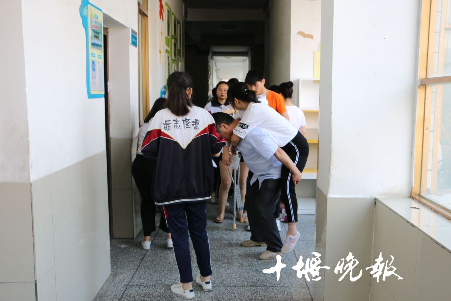 人群中有一位中年男子,背着一位脚缠绷带的女生进入考场 背人男子是竹溪县一中的一位高三班主任,名叫郭联福。