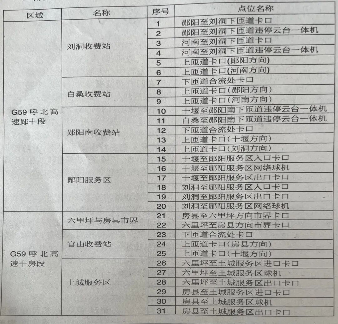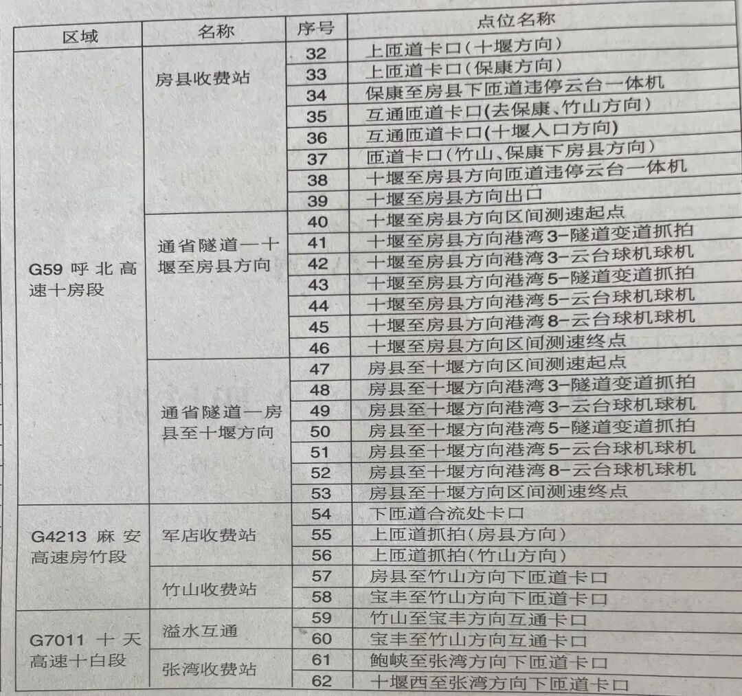 二、启用时间公安机关高速公路警察部门将于2022年4月1日起开始启用电子监控抓拍设备,对上述交通违法行为进行实时视频取证,并依法给予处罚三、具体点位(见下表)请广大驾驶员朋友自觉遵守有关规定,文明驾驶、规范行车,共同营造安全、有序、畅通的道路交通环境。