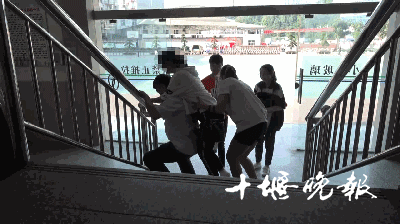 人群中有一位中年男子,背着一位脚缠绷带的女生进入考场 背人男子是竹溪县一中的一位高三班主任,名叫郭联福。